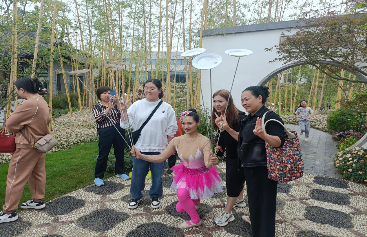 扬州馆内省杂技团演员表演的杂技《转碟》,吸引了游客打卡拍照。