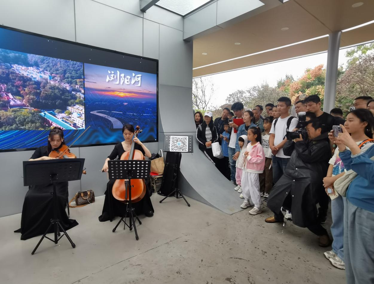 安徽乐团演奏员在长沙馆为游客演奏管弦四重奏《浏阳河》。